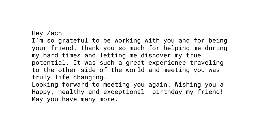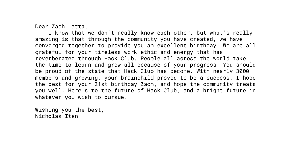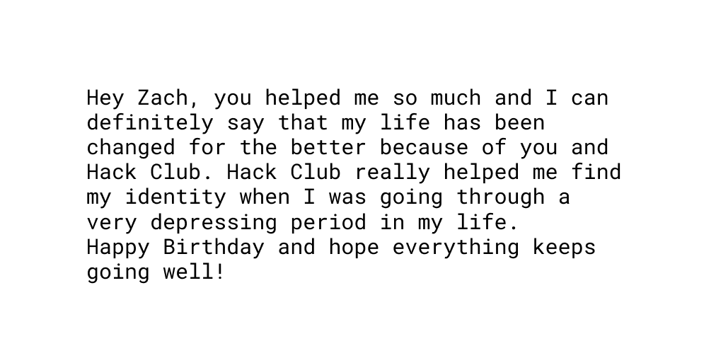 Hey Zach! Happy 21st birthday. The contributions you have made to this community are absolutely incredible. You inspire me to work hard, and I hope you understand how much of an impact you’ve had. But anyway, you’re 21! Party it up, enjoy dude.